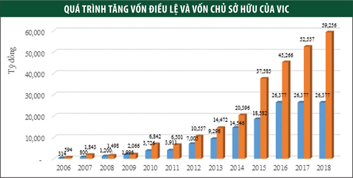 Hiện vốn điều lệ của VIC đạt 26.377 tỷ đồng, tăng 134,5 lần so với ngày đầu thành lập và trở thành doanh nghiệp niêm yết có giá trị vốn hóa lớn nhất TTCK Việt Nam. Giá cổ phiếu VIC (sau điều chỉnh) ngày 21/5/2018 gấp 4,7 lần thời điểm đầu năm 2012 và gấp hơn 8 lần so với đầu năm 2009 khi phát hành các đợt trái phiếu quốc tế chuyển đổi.