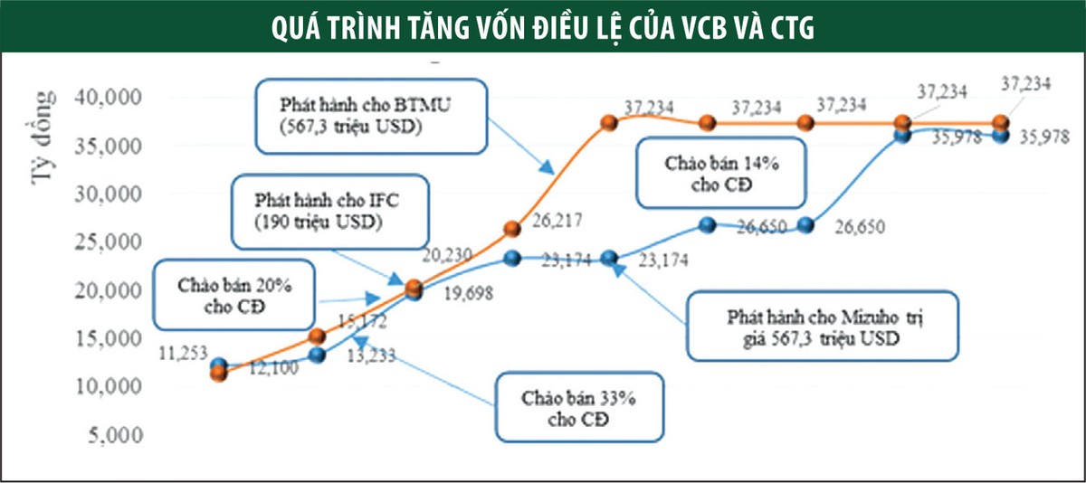 Nguồn vốn từ đối tác chiến lược và lợi nhuận giữ lại, những đợt chào bán cổ phiếu ra TTCK cũng đã góp phần quan trọng để sau 11 năm cổ phần hóa và 9 năm niêm yết, vốn điều lệ của VCB hiện đã tăng gần 3 lần lên 35.978 tỷ đồng, tổng tài sản vượt mức 1 triệu tỷ đồng. Tại CTG, vốn điều lệ hiện gấp 3,5 lần khi IPO năm 2008.