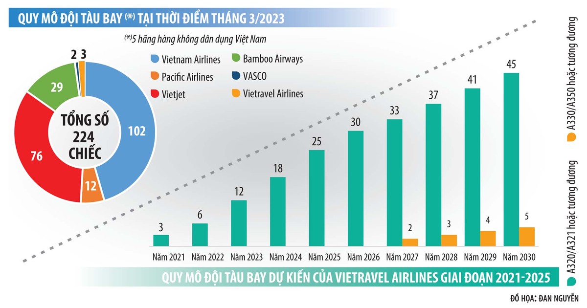 Theo đề xuất Dự án điều chỉnh, Vietravel Airlines dự kiến phát triển đội bay trong giai đoạn 2021 - 2025 là 25 tàu bay và giai đoạn 2026 - 2030 là 50 tàu bay. Hãng bổ sung 3 tàu bay trong năm 2022 và 6 tàu bay vào năm 2023. Tuy nhiên, theo thực tế triển khai, hiện nay, Vietravel mới chỉ có tổng cộng 3 tàu bay thuê khô (A321) nằm trong Giấy chứng nhận người khai thác tàu bay. Do đó, Bộ GTVT đánh giá kế hoạch bổ sung tàu bay cho 2 giai đoạn này của Vietravel Airlines là chưa phù hợp với thực tế.