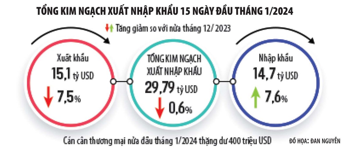 Theo dữ liệu của Tổng cục Hải quan, 15 ngày đầu tháng 1/2024, xuất khẩu của Việt Nam đạt 15,1 tỷ USD, giảm 7,5% so với nửa cuối tháng 12/2023. Kết quả này cho thấy, hoạt động thương mại quốc tế những ngày đầu năm 2024 vẫn tiếp tục theo hướng chậm lại của năm 2023.