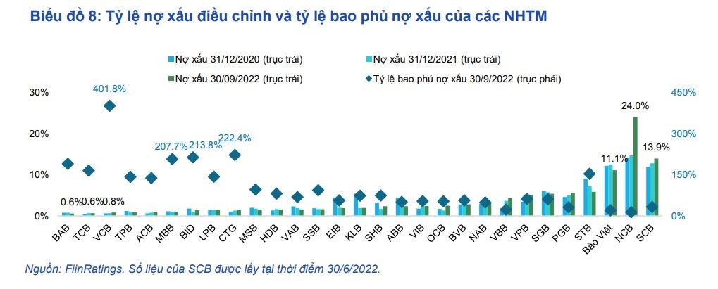 Theo FiinRatings, sau khi thời gian cơ cấu thời hạn trả nợ cho khách hàng chịu ảnh hưởng bởi dịch Covid-19 theo Thông tư 14/2021/TT-NHNN kết thúc (30/6/2022), các ngân hàng bắt đầu đối mặt với nguy cơ gia tăng các khoản nợ xấu. Tỷ lệ nợ xấu điều chỉnh (nợ xấu nội bảng và trái phiếu đặc biệt do VAMC phát hành) tại thời điểm 30/9/2022 của toàn ngành là khoảng 2,6%, tăng nhẹ so với mức 2,5% hồi đầu năm. Nhiều ngân hàng lớn cũng tăng nhẹ tỷ lệ nợ xấu từ 0,1 - 0,3 điểm phần trăm.