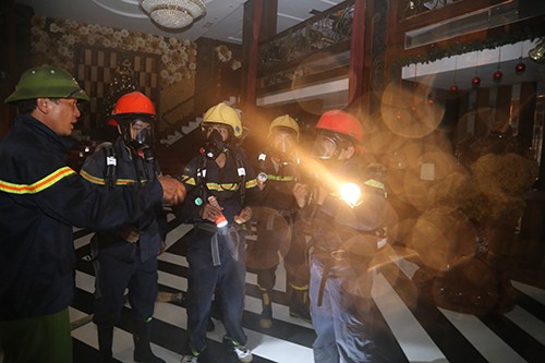 Ít phút sau, bốn xe chữa cháy cùng hàng trăm lính cứu hỏa có mặt. Các chiến sĩ đeo mặt nạ phòng độc, bình dưỡng khí tiếp cận khu vực cháy bằng cầu thang bộ, sau đó kéo vòi rồng lên dập lửa.