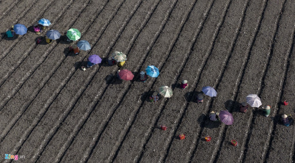 Các chủ vườn kiệu có thói quen xuống giống đồng loạt cho mỗi vụ. Vì thế, họ huy động, thuê… hàng chục người cho mỗi buổi trồng kiệu. Nhiều người trồng kiệu cho biết trước đây họ không biết che dù để trồng kiệu như bây giờ. Họ nói rằng những năm gần đây, nhiều người trồng kiệu tự bảo nhau và đưa ra "sáng kiến" này. Quả thật, việc che dù trồng kiệu giúp họ đỡ mất sức dưới trời nắng gay gắt.