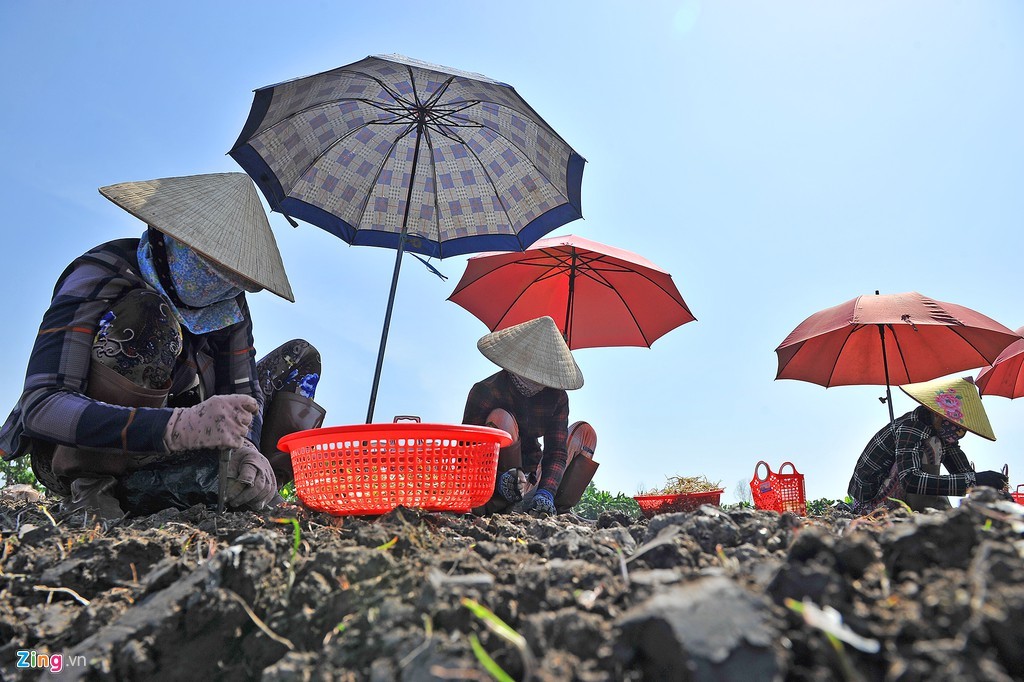 Chị Bé Năm tham gia trồng kiệu trên một cách đồng xã Mỹ Thái. Chị năm nay 46 tuổi, thường làm thuê cho các chủ vườn kiệu mùa Tết. Chị Năm làm việc từ khoảng 6h sáng đến 13h trưa. Với khoảng thời gian này, tiền công chị được trả 130 nghìn đồng. Đây cũng là giá nhân công trồng kiệu được áp dụng khá đại trà tại huyện Hòn Đất.