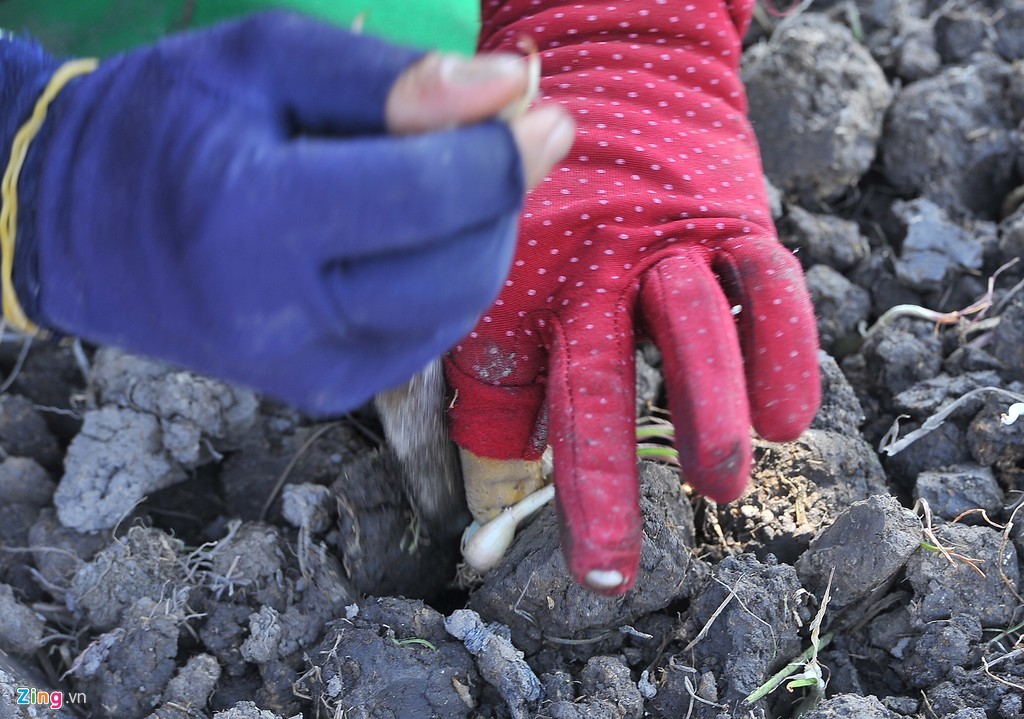 Người trồng kiệu một tay dùng dao nhọn xới lỗ đất, tay kia cho kiệu giống xuống. Động tác này được người trồng thực hiện rất nhanh, trông khá bắt mắt.