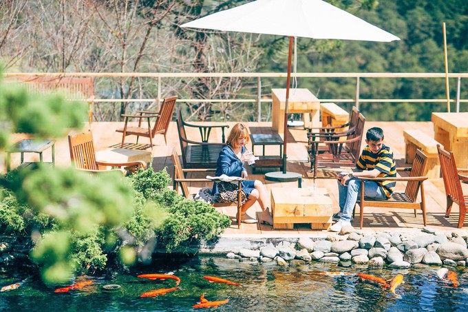Bàn ghế được xếp ngăn nắp, có ô che nắng cho phép du khách có thể vừa ngồi thư giãn quanh hồ cá Koi, vừa nhâm nhi đồ uống. Thực đơn ở đây đa dạng với giá trung bình 30.000 đồng. Bạn phải mua vé vào tham quan, giá 40.000 đồng một người lớn, 20.000 đồng cho trẻ em.
