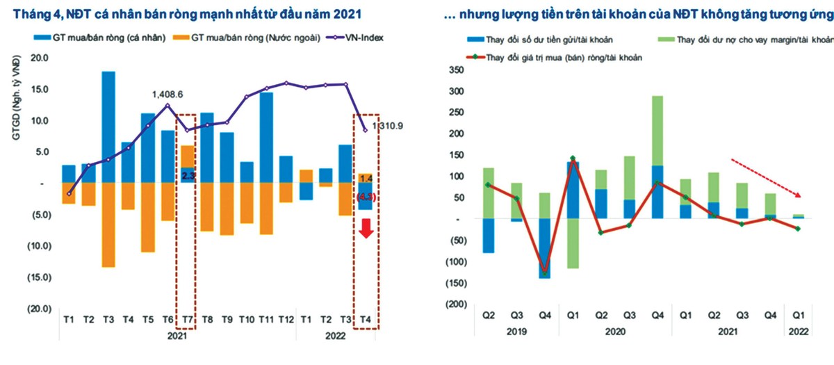 Theo báo cáo bối cảnh thị trường chứng khoán quý II/2022 do FiinTrade vừa thực hiện, thanh khoản toàn thị trường sụt giảm mạnh. Đáng lưu ý, các nhà đầu tư cá nhân trong nước bán ròng 4.300 tỷ đồng trong tháng 4, mức bán ròng mạnh nhất kể từ đầu năm 2021, trong khi trước có hầu hết đều mua ròng, có tháng mua hàng chục ngàn tỷ đồng như tháng 11/2021.