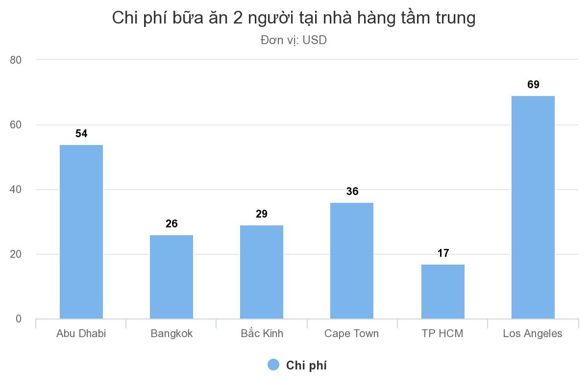 Ở TP HCM, một bữa ăn hai người tại nhà hàng tầm trung tốn 17 USD, tức gần 400.000 đồng. Tại Đông Nam Á, báo cáo chỉ có số liệu hạng mục tương tự tại Bangkok. Chi phí cho bữa ăn hai người tại nhà hàng tầm trung thủ đô Thái Lan là 26 USD, tức hơn 600.000 đồng. So với các nơi khác có ghi nhận số liệu trong khảo sát 35 thành phố trên thế giới thì bình quân chi phí ăn uống tại TP HCM cũng rẻ nhất.