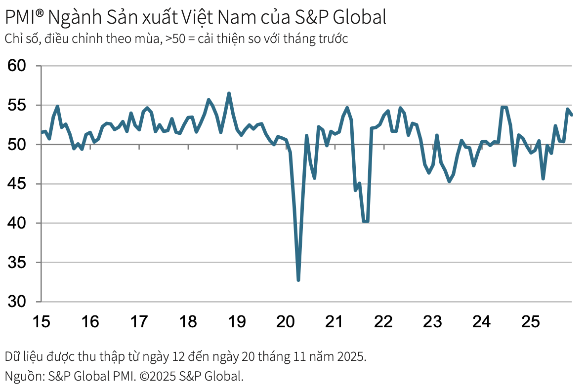 Theo báo cáo mới nhất của S&P Global, dữ liệu tháng 11 cho thấy tăng trưởng của ngành sản xuất Việt Nam tiếp tục được duy trì. Sản lượng, số lượng đơn đặt hàng mới và việc làm đều tăng, dù nhiều báo cáo ghi nhận tình trạng gián đoạn do bão lớn ảnh hưởng đến chuỗi cung ứng và khả năng hoàn thành công việc đúng hạn của các nhà sản xuất. Các vấn đề về nguồn cung do bão cũng khiến áp lực lạm phát gia tăng, khi chi phí đầu vào tăng mạnh và các công ty buộc phải điều chỉnh giá bán.