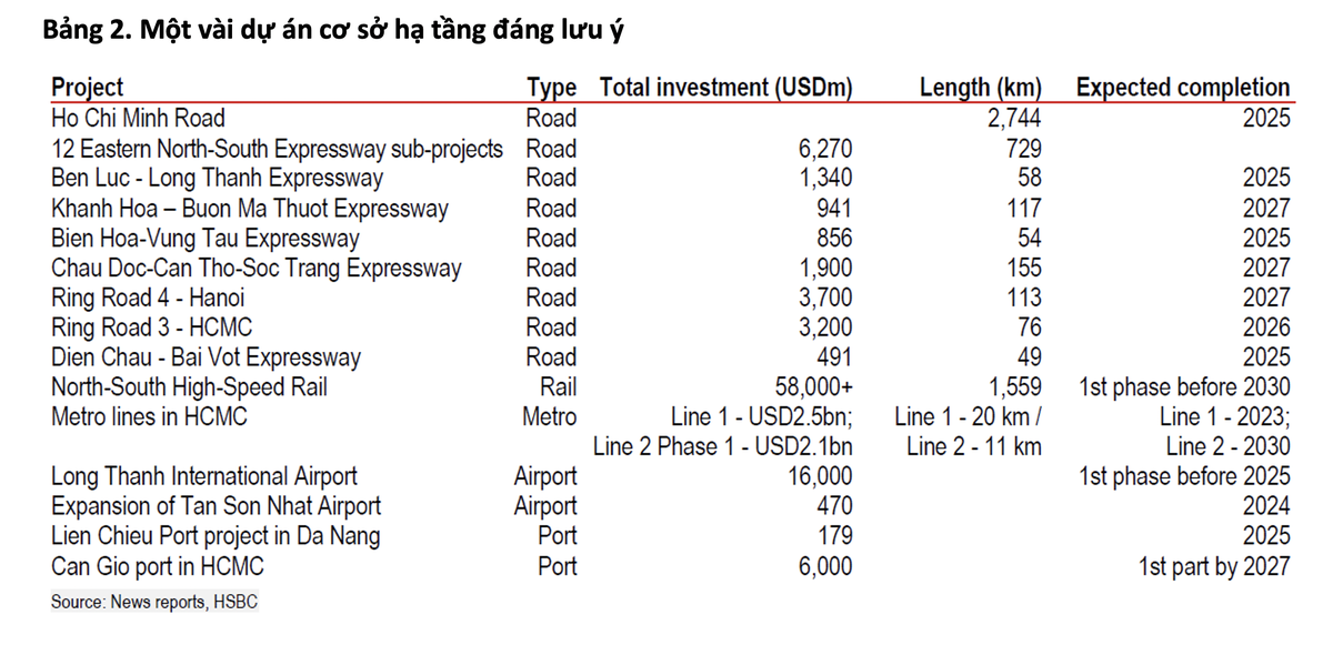 “Các nhà chức trách đã nhận ra vấn đề này và thúc đẩy các dự án như sân bay quốc tế Long Thành, đường sắt cao tốc Bắc - Nam và các tuyến tàu điện ngầm mới của TP. Hồ Chí Minh để tạo điều kiện thuận lợi cho việc vận chuyển hành khách và hàng hóa”, Báo cáo HSBC nhận định.