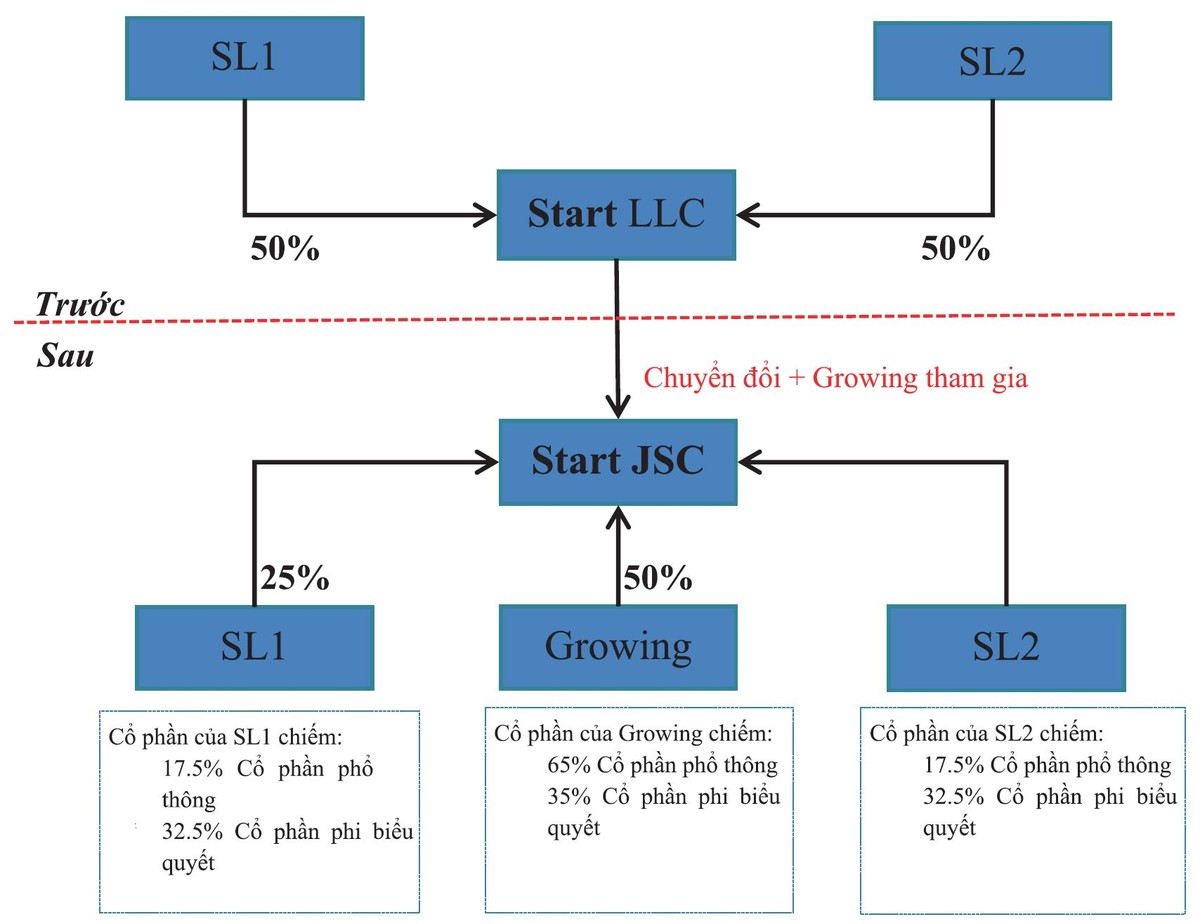 Để đạt được thỏa thuận đó, có thể: kết hợp phát hành cổ phần cho Growing, chuyển đổi Start thành công ty cổ phần (Start JSC); bố trí để trong tổng số cổ phần trong Start JSC: (a) một số cổ phần của SL1 và SL2 được chuyển thành cổ phần phổ thông, theo đó SL1 và SL2 mỗi người nắm 17,5% tổng số cổ phần phổ thông trong Start JSC; (b) số cổ phần còn lại của SL1 và SL2 được chuyển thành cổ phần ưu đãi phi biểu quyết (chẳng hạn, cổ phần ưu đãi hoàn lại), theo đó SL1 và SL2 mỗi người nắm 32,5% tổng số cổ phần ưu đãi hoàn lại trong Start JSC; và (c) với số cổ phần phát hành cho Growing: số cổ phần phổ thông của Growing chiếm 65% tổng số cổ phần phổ thông trong Start JSC và phần còn lại là cổ phần ưu đãi phi biểu quyết, chiếm 35% cổ phần ưu đãi hoàn lại trong Start JSC.