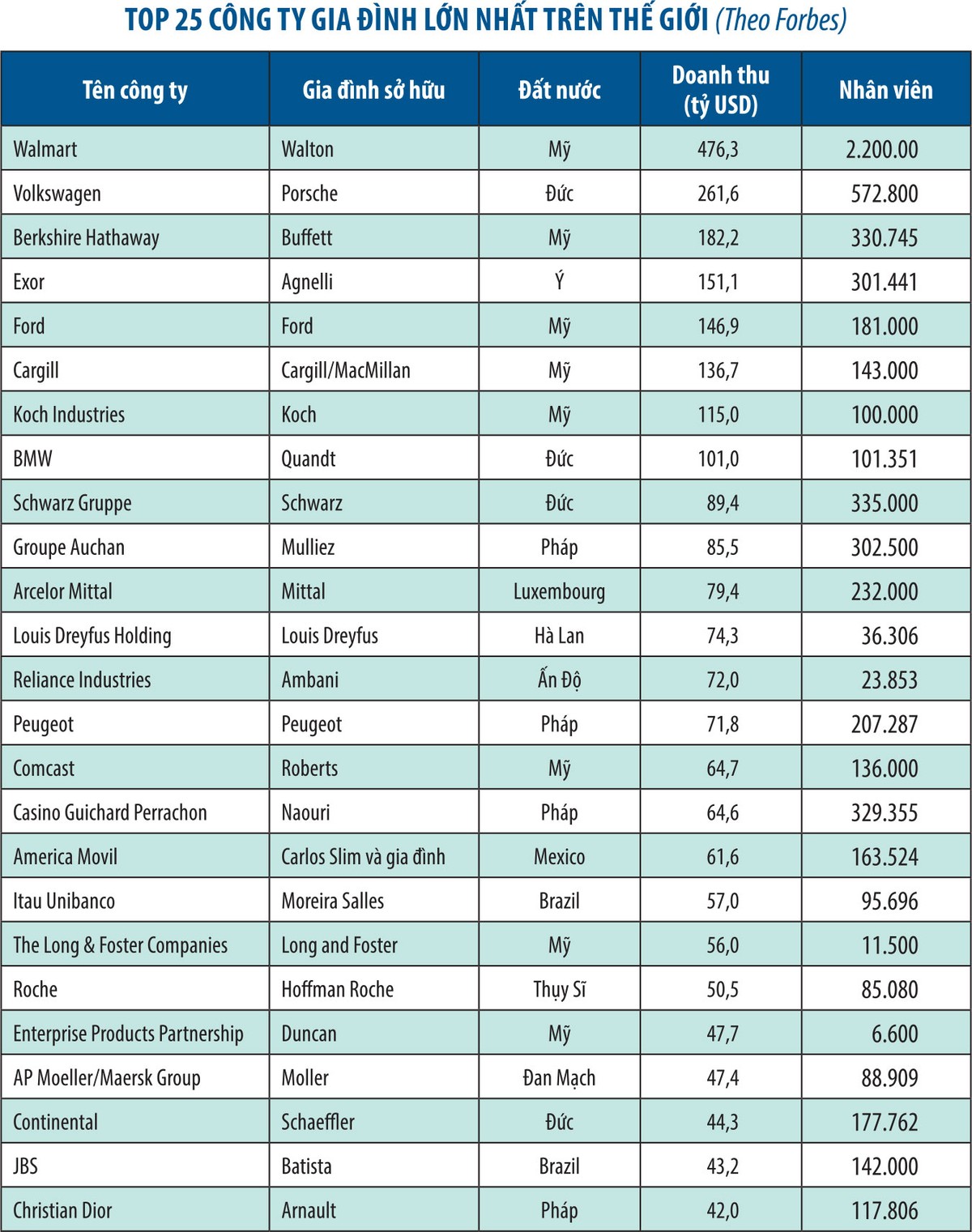Tại Mỹ, doanh nghiệp tư nhân tạo 78% việc làm mới mỗi năm, với 60% tổng số nhân lực trên thị trường. Trong khi đó, các công ty gia đình hiện chiếm tới 1/3 danh sách doanh nghiệp thuộc chỉ số S&P 500, 40% trong số 250 công ty lớn nhất Pháp và Đức, hơn 60% doanh nghiệp lớn nhất tại Đông Á và châu Mỹ Latin.