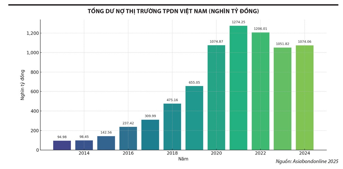 Theo ADB (Asianbondonline), lũy kế đến hết năm 2024, quy mô dư nợ thị trường TPDN Việt Nam đạt khoảng 1,07 triệu tỷ đồng, tương đương 9,3% GDP năm 2024. Con số này đã giảm khoảng 21% so với thời điểm cuối năm 2021 bởi hoạt động mua lại diễn ra mạnh mẽ (tổng giá trị mua lại giai đoạn 2022-2024 lên tới hơn 600.000 tỷ đồng), cùng với đó là khối lượng phát hành mới suy giảm do tâm lý thị trường và các quy định mới siết chặt hơn hoạt động phát hành trái phiếu riêng lẻ.