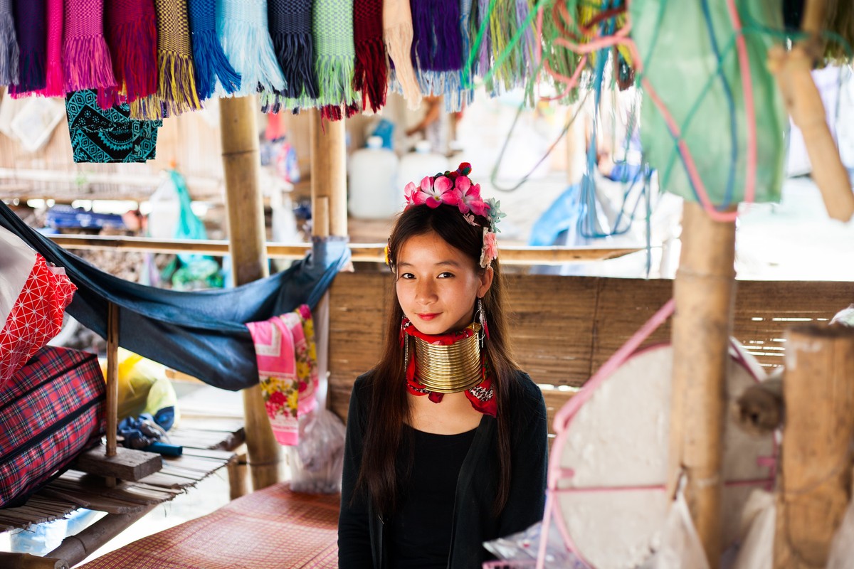 Buổi sáng tiếp theo, tôi cùng hai người bạn Anh mới quen đến làng cổ dài của người Long Neck thuộc Vườn quốc gia Chiang Mai, cách trung tâm khoảng 30 phút lái xe. Lối đi vào yên tĩnh, mộc mạc với ruộng lúa xanh mượt như tranh vẽ, khiến lòng tôi cảm thấy nhẹ nhàng. Làng khá vắng vẻ, lưa thưa vài túp nhà lá hai bên đường dẫn dần lên dốc không cao lắm. Trước mỗi căn nhà, các cô gái đeo những vòng kiềng bằng kim loại quanh cổ từ khi còn bé ngồi dệt thổ cẩm với nhiều màu sắc khác nhau.