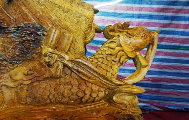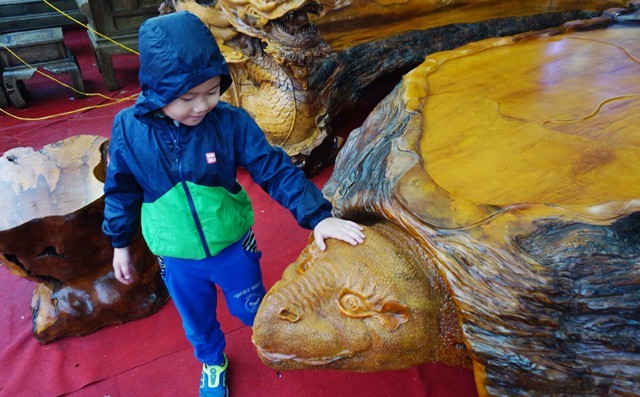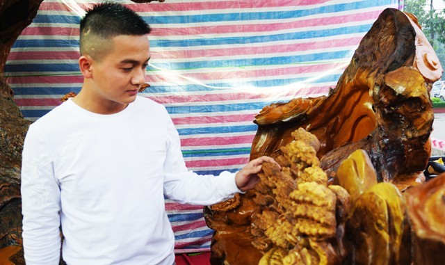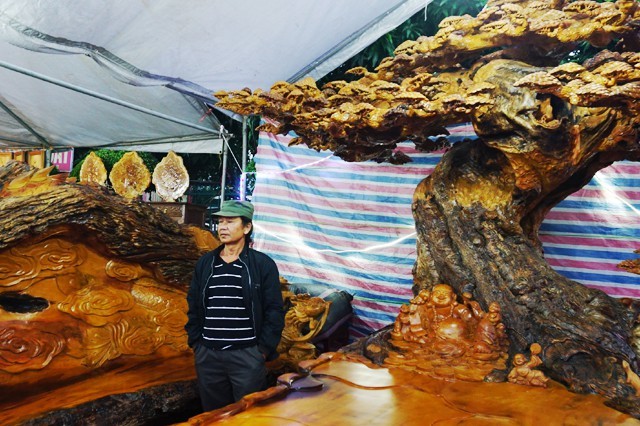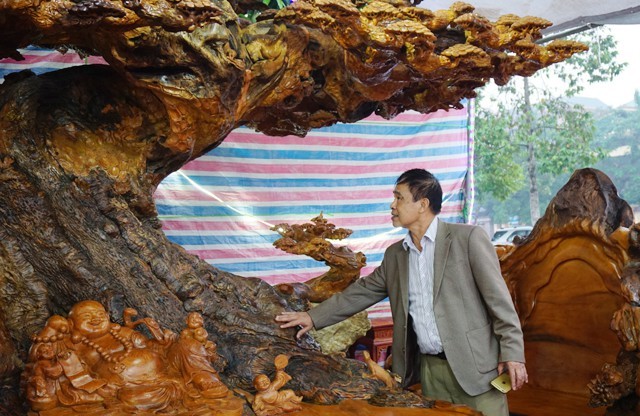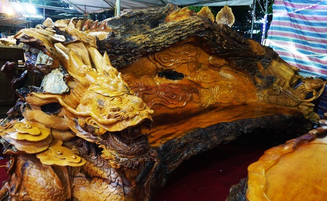 Bộ bàn ghế “tứ linh” được giới thiệu làm bằng gỗ trai nghìn năm tuổi chào bán với giá 2,8 tỷ đồng gây “náo loạn” Hội chợ công thương Bắc Trung Bộ. Tuy nhiên du khách chỉ đứng ngắm nghía trầm trồ chứ không dám bỏ ra gần 3 tỷ đồng để sở hữu bộ sản phẩm hoành tráng này.