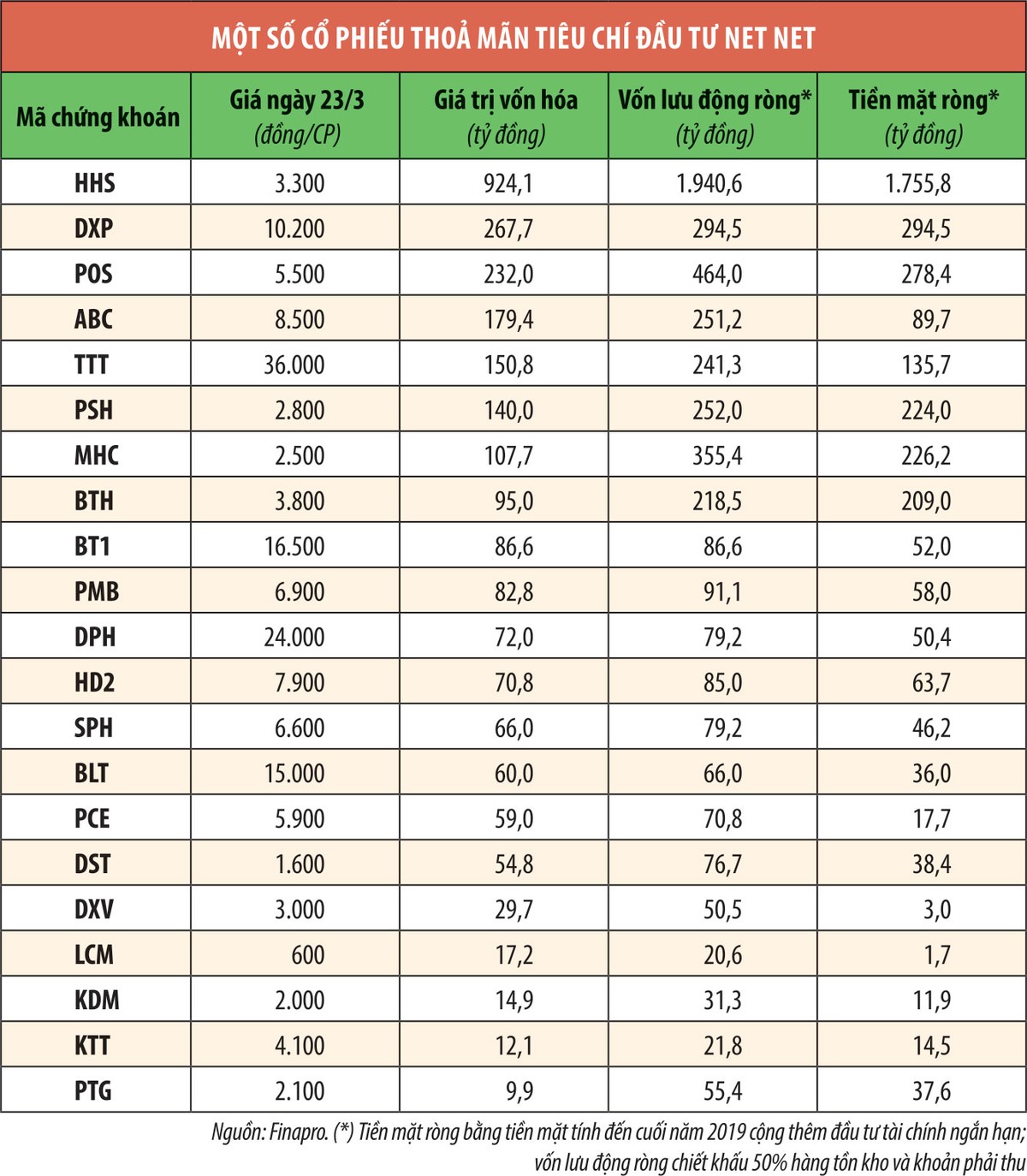Tính đến ngày 23/3/2020, có tổng cộng 1.627 cổ phiếu được giao dịch trên ba sàn chứng khoán Việt Nam, trong đó hàng chục doanh nghiệp đáp ứng được tiêu chí đầu tư theo phương pháp Net Net (xem bảng).