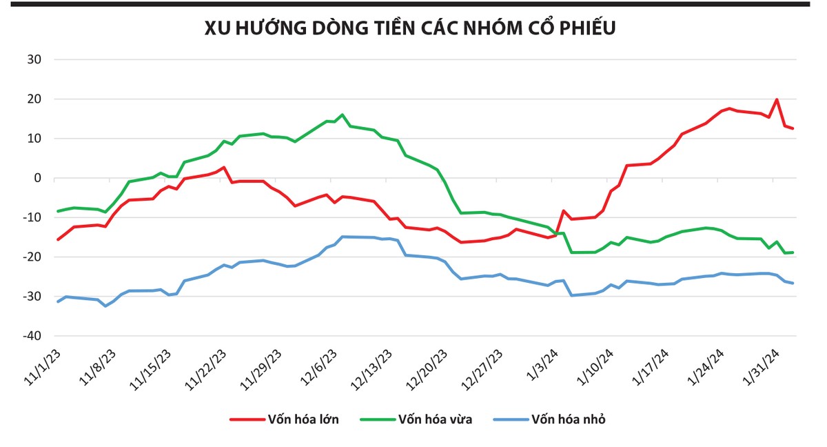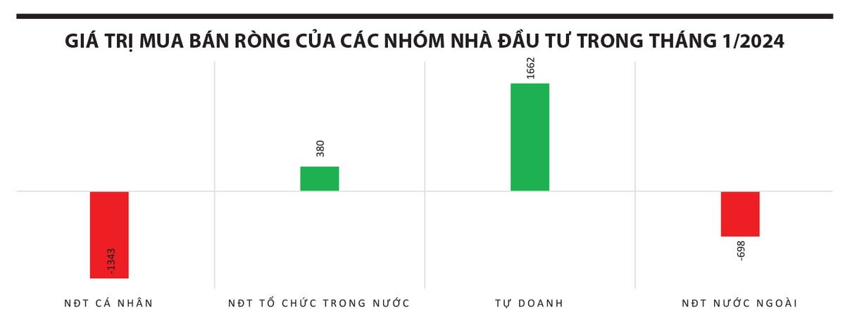 VN-Index có tuần giao dịch thử thách tâm lý quan trọng trước thềm nghỉ Tết, lực bán chốt lời xuất hiện trên diện rộng, đặc biệt là ở nhóm cổ phiếu đã tăng nhiều trong thời gian qua như ngân hàng. Dù vậy, khi cuộc chơi lúc này vẫn đang nằm trong tay các nhà đầu tư tổ chức và tự doanh thì khả năng thị trường giảm sốc rất khó xảy ra. Thống kê trong tháng 1/2024, nhóm nhà đầu tư tổ chức và tự doanh mua ròng lần lượt 380 tỷ đồng và 1.662 tỷ đồng, trong khi nhóm các nhà đầu tư cá nhân và nước ngoài bán ròng lần lượt 1.343 tỷ đồng và 698 tỷ đồng.