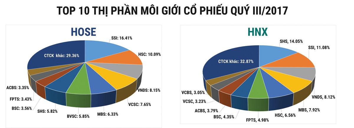 Cùng với bức tranh sáng màu của thị trường, cuộc đua giành thị phần môi giới giữa các CTCK diễn ra sôi động và quyết liệt. Trên HOSE, top 10 CTCK lớn chiếm 70,6% thị phần môi giới, còn trên HNX, top 10 CTCK chiếm 67,1% thị phần.