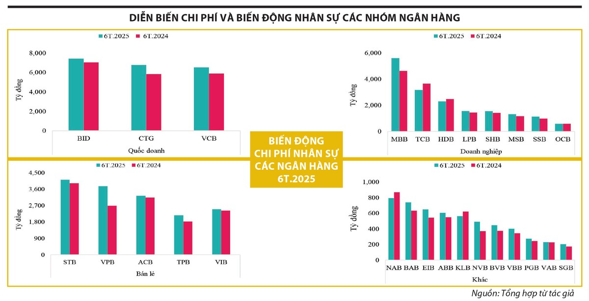 Dữ liệu tổng hợp từ báo cáo tài chính của các ngân hàng thương mại cho thấy, trong 6 tháng đầu năm nay, chi phí nhân sự trung bình của các nhóm ngân hàng tiếp tục tăng mạnh so với cùng kỳ, trong khi lực lượng lao động tại nhiều nhóm lại có xu hướng điều chỉnh theo hướng tinh gọn. Đây là dấu hiệu cho thấy các ngân hàng đang đầu tư chiến lược vào nhân lực chất lượng cao như một lợi thế cạnh tranh dài hạn, đặc biệt trong bối cảnh chuyển đổi số và chuẩn bị cho các giai đoạn hội nhập tiếp theo.
