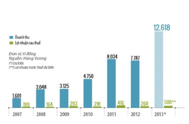 Nếu như năm đầu tiên thành lập, 2003, doanh số của Hùng Vương chỉ đạt vỏn vẹn 8 tỷ đồng, thì đến năm 2012 đã xác lập kỷ lục doanh thu 8.000 tỷ đồng.