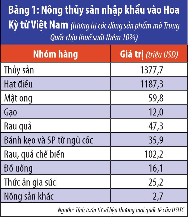 Bảng 1 minh họa cơ cấu 2,9 tỷ USD hàng nông thủy sản của Việt Nam xuất sang Hoa Kỳ và cạnh tranh với hàng Trung Quốc. Thủy sản xuất khẩu sang Hoa Kỳ sẽ là nhóm hàng hưởng lợi từ việc các sản phẩn tương tự từ Trung Quốc chịu thuế cao hơn.