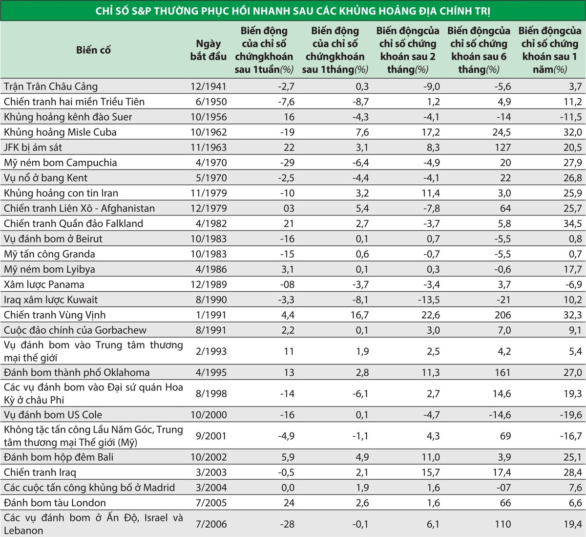 Trung bình, chỉ số S&P 500 tăng giảm 6,5% trong 3 tháng sau một cuộc xung đột vũ trang (toàn cầu hoặc nhỏ hơn) và khoảng 13% trong 12 tháng sau cuộc xung đột nói trên.