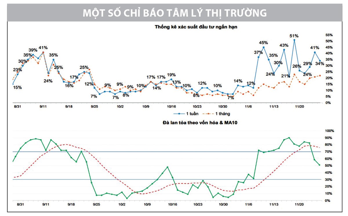 Các chỉ báo tâm lý thị trường thể hiện đà lan tỏa đã cắt mạnh xuống MA10, trong bối cảnh thống kê xác suất đầu tư ngắn hạn có sự trồi sụt, thể hiện tâm lý nhà đầu tư bắt đầu mệt mỏi khi liên tục giải ngân nhưng lại không thu được lợi nhuận ngắn hạn.