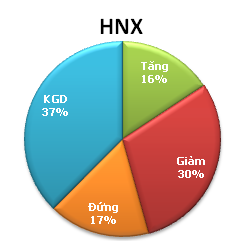 Trong tổng số 394 mã niêm yết trên HNX, số mã tăng là 62 (chiếm 15,7%), số mã giảm là 118 số mã đứng giá là 66 và không có giao dịch là 148 mã.