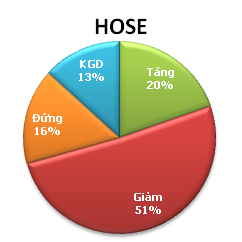 Trong số 310 cổ phiếu niêm yết trên HOSE, có 61 mã tăng (chiếm 19,7%), 158 mã giảm, 50 mã đứng giá và 41 mã không có giao dịch.