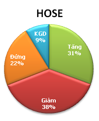 Trong số 310 cổ phiếu niêm yết trên HOSE, có 95 mã tăng (chiếm 30,6%), 119 mã giảm, 69 mã đứng giá và 27 mã không có giao dịch.