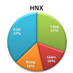 Số mã tăng trên HNX là 119 (chiếm 30,4% trong tổng số 392 mã niêm yết), số mã giảm là 63 số mã đứng giá là 64 và không có giao dịch là 146 mã.