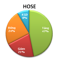 Trong số 310 cổ phiếu niêm yết trên HOSE, có 145 mã tăng (chiếm 46,8%), 64 mã giảm, 75 mã đứng giá và 26 mã không có giao dịch.