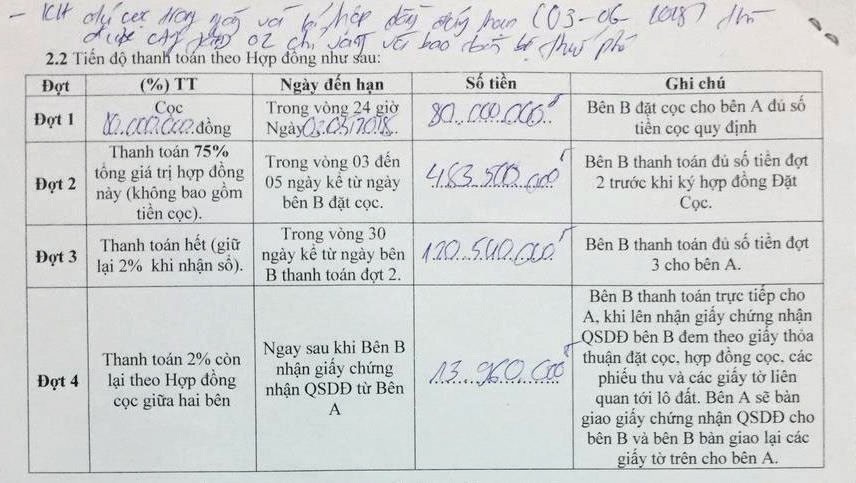 Theo phản ánh của các khách hàng, thường thì sau khi đã xuống cọc lần 1 (một phần tiền cọc), trong thỏa thuận đặt cọc của sàn giao dịch thường yêu cầu khách hàng phải tiếp tục đóng đủ cọc trong 24 giờ, nếu không sẽ mất số tiền trước đó. Tiếp theo, chỉ trong 3 - 5 ngày, khách hàng phải đóng đủ 75% giá trị lô đất theo hợp đồng, 30 ngày tiếp theo thanh toán 98% giá trị lô đất, 2% sẽ thanh toán khi nhận sổ.