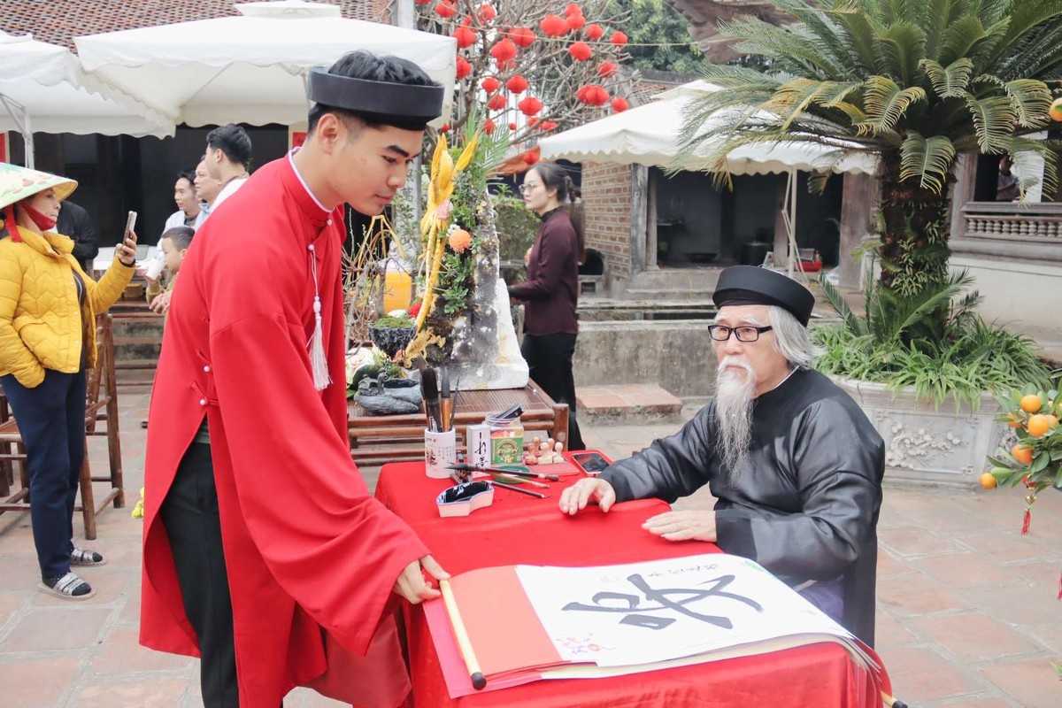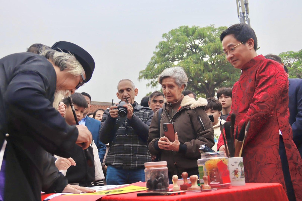Bí thư Thị ủy Sơn Tây Trần Anh Tuấn cùng các đại sứ quán, du khách xin chữ ông đồ. |