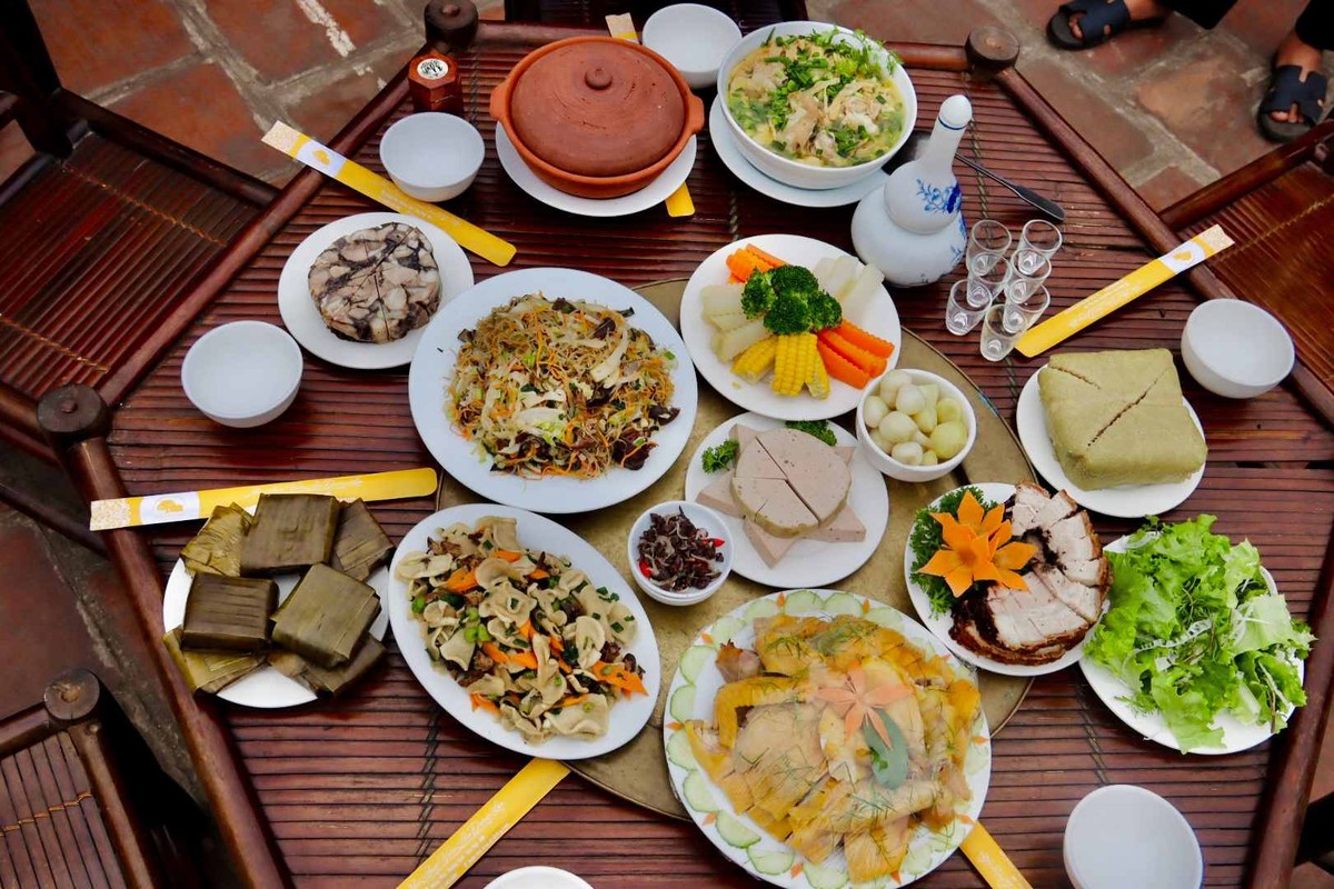 Không dừng lại ở đó, du khách còn được tham quan các ngôi nhà cổ nhuốm màu thời gian và thưởng thức trọn vẹn hương vị Tết qua các món đặc sản của người dân Đường Lâm như bánh chưng xanh, gà Mía thơm ngon, thịt quay đòn giòn rụm, hay chè kho ngọt ngào, tinh tế.