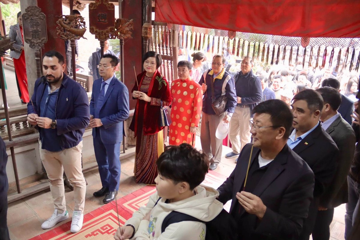 Tham quan và chia sẻ với các Đại sứ, Phó bí thư Thường trực Thành ủy Nguyễn Văn Phong vui mừng giới thiệu về những điểm nổi bật đặc sắc của Làng cổ Đường Lâm, cũng như nỗ lực của thị xã trong việc bảo tồn, phát huy giá trị của cụm di tích đặc biệt này.