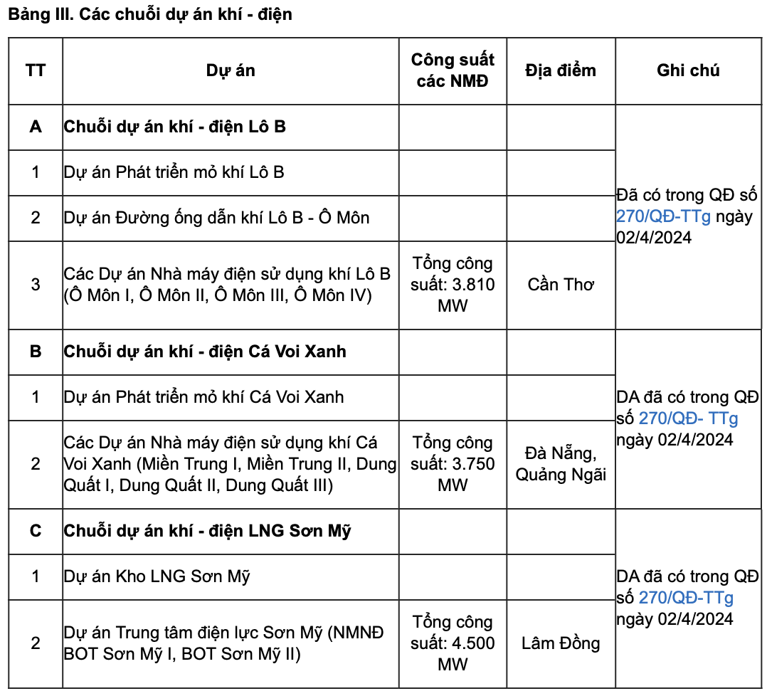 Ngày 02/12/2025, Thủ tướng Chính phủ đã ban hành Quyết định số 2634/QĐ-TTg về việc phê duyệt Danh mục các công trình, dự án quan trọng quốc gia, trọng điểm ngành năng lượng, bao gồm nhiều dự án trọng điểm như: Chuỗi dự án khí - điện Lô B, Chuỗi dự án khí - điện Cá Voi Xanh, Chuỗi dự án khí - điện LNG Sơn Mỹ.