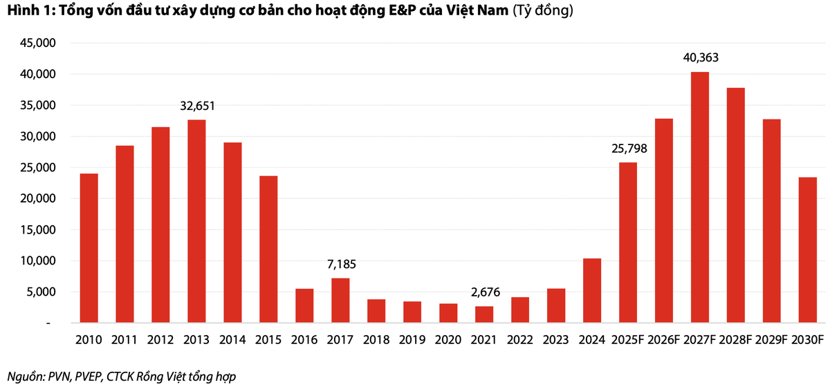“Nhịp tăng vốn đầu tư E&P năm 2025 được xem là tín hiệu xác nhận cho sự đảo chiều của chu kỳ thượng nguồn, tạo nền tảng cho sự phục hồi bền vững của hoạt động thăm dò khai thác trong giai đoạn 2025-2027”, VDSC nhận định.