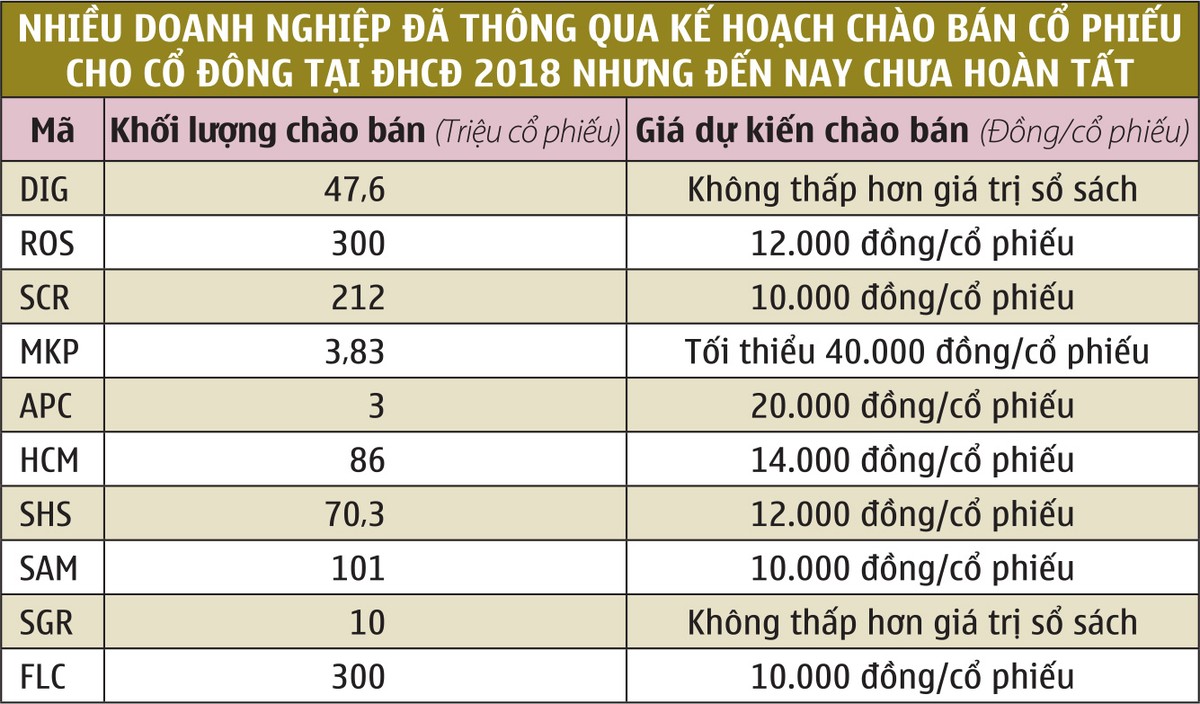 Trễ hẹn các kế hoạch chào bán tăng vốn khi thời gian của năm 2018 đã hết cũng là câu chuyện chung của nhiều doanh nghiệp khác như CTCP Chứng khoán TP. HCM (HCM), CTCP SAM Holding (SAM), CTCP Chứng khoán Sài Gòn - Hà Nội (SHS), CTCP Tập đoàn FLC (FLC)...