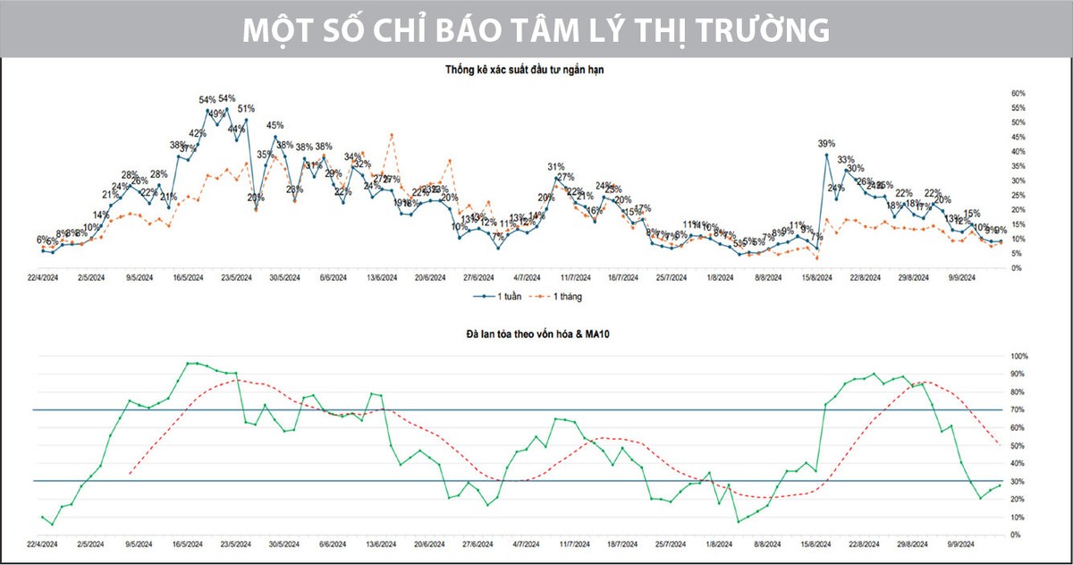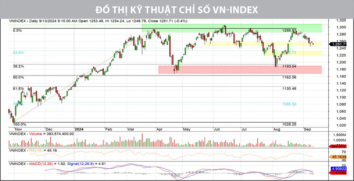 Dưới góc nhìn kỹ thuật, nhịp điều chỉnh vẫn đang diễn ra và ngưỡng hỗ trợ đầu tiên tại 1.265 điểm (MA20) đã bị vi phạm, VN-Index kiểm tra ngưỡng hỗ trợ tiếp theo tại 1.250 điểm và có thể sẽ là 1.225 điểm. Tại ngưỡng 1.250 điểm, vận động của chỉ số cho thấy sự chững lại và giằng co trong những phiên giao dịch cuối tuần. Tuy nhiên, thanh khoản sụt giảm, về mức thấp nhất trong 17 tháng qua, thể hiện áp lực bán giảm nhưng bên mua vẫn ở trạng thái thận trọng, thiếu tự tin để giúp chỉ số xác nhận đảo chiều xu hướng. Diễn biến này xảy ra sau loạt thông tin về bão lũ diễn ra tại khu vực phía Bắc, cùng với việc nhà đầu tư toàn cầu vẫn đang chờ đợi thêm thông tin về quyết định lãi suất của Fed trong cuộc họp tháng 9 và những lo ngại xoay quanh cuộc bầu cử Tổng thống Mỹ sẽ diễn ra ngày 5/11.