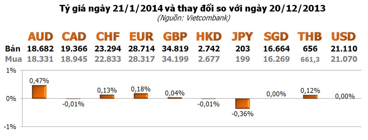 Với các ngoại tệ khác, hầu hết không thay đổi đáng kể so với ngày hôm qua. AUD của Úc tăng mạnh nhất và cũng là đồng tiền biến động nhiều nhất với 0,47%. Ngược lại, JPY giảm mạnh nhất, biến động nhì với -0,36%. Các ngoại tệ còn lại tăng/giảm từ 0,18% trở xuống.