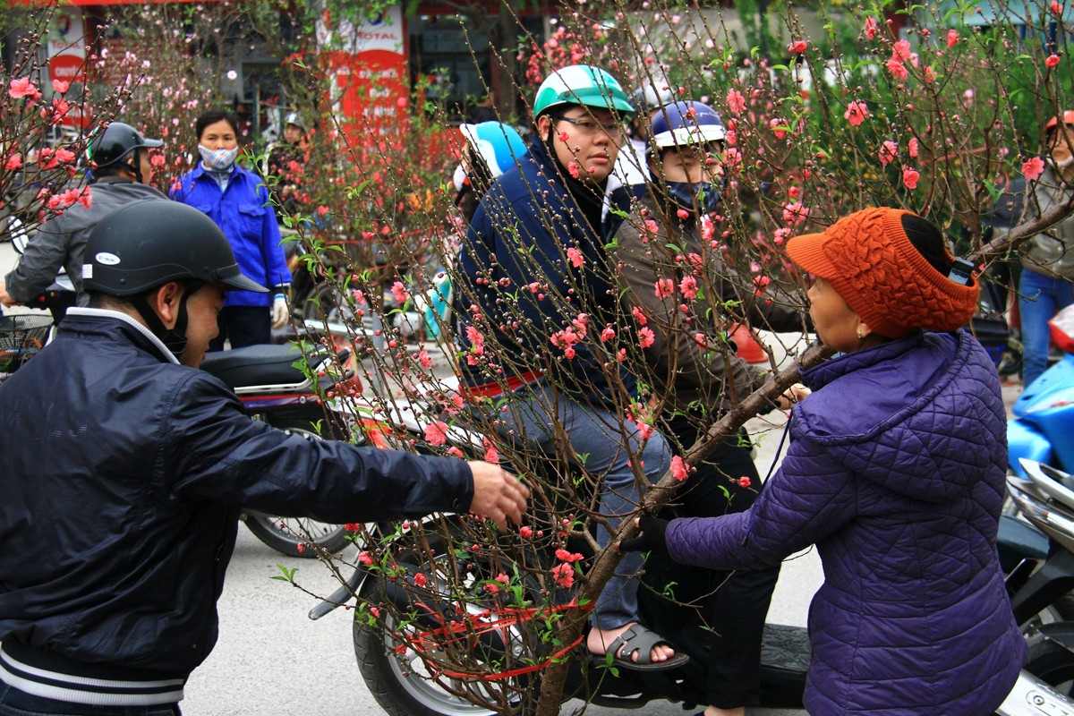 Sau khi chọn được cành đào ưng ý, hoa sẽ được chằng, buộc cẩn thận sau yên xe. Ảnh: Thành Nguyễn.