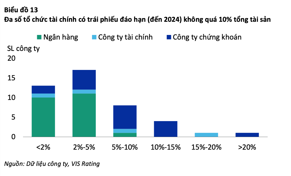 “Rủi ro thanh khoản và tái cấp vốn có thể kiểm soát được, vì trái phiếu đáo hạn trong hai năm tới chiếm dưới 10% tổng tài sản đối với hầu hết các ngân hàng và công ty chứng khoán. Các ngân hàng chủ yếu huy động vốn thông qua tiền gửi của khách hàng. Trong khi các đợt tăng vốn cổ phần gần đây của các công ty chứng khoán đã giúp họ bắt kịp đà tăng trưởng của ngành”, VIS Rating nhận định.