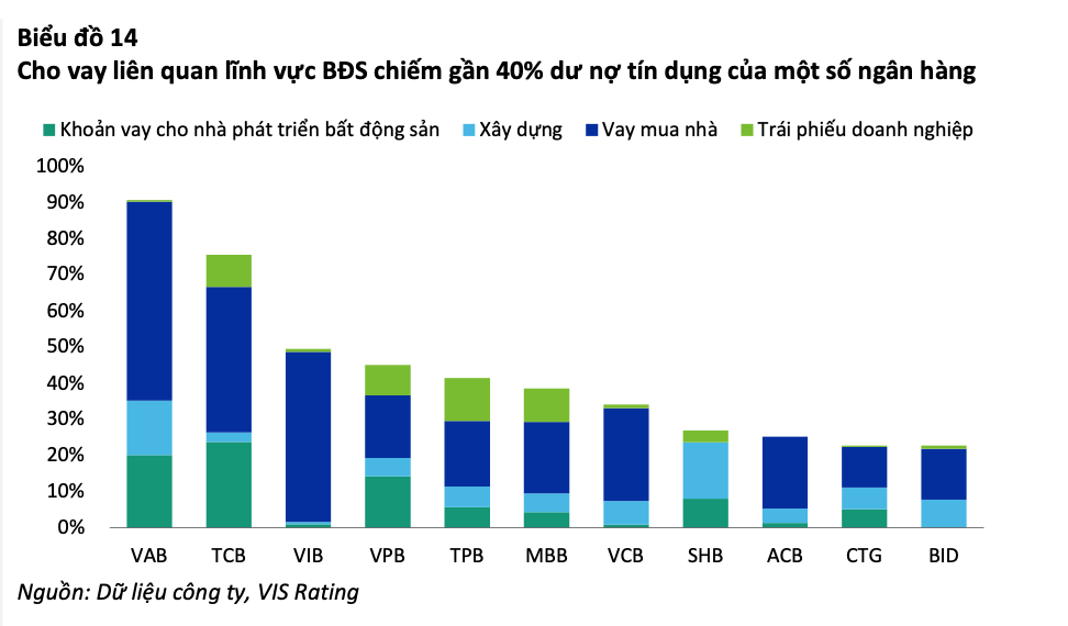 Trong số các ngân hàng tập trung ở lĩnh vực bất động sản, tổng các khoản cho vay và trái phiếu liên quan đến bất động sản chiếm khoảng 40% tổng dư nợ tín dụng vào cuối năm 2022. Những nhà băng có tỷ trọng khoản vay và trái phiếu liên quan đến bất động sản lớn nhất phải kể tới Ngân hàng Việt Á, Techcombank, VIB, VPBank, TPBank, MB Bank…