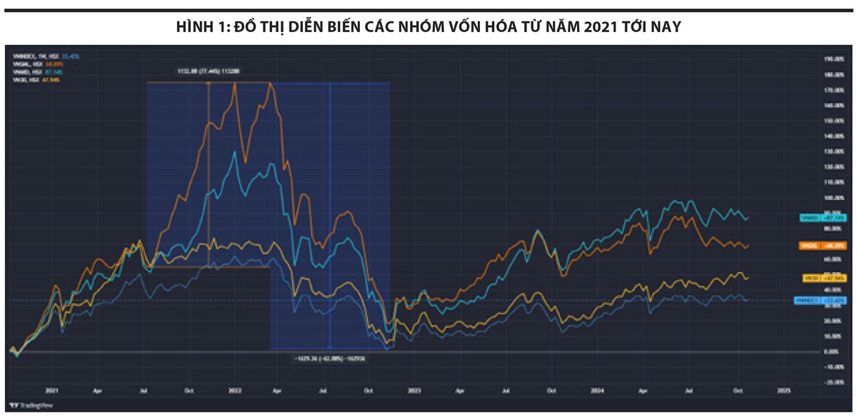 Thứ nhất là do sóng đầu cơ tăng mạnh. Nhìn vào Hình 1, có thể thấy, trong giai đoạn thị trường chứng khoán tạo đỉnh, hiệu suất của nhóm VNSmallcap (77,44%), VNMidcap (50,1%) vượt trội so với VN30 (8,2%).