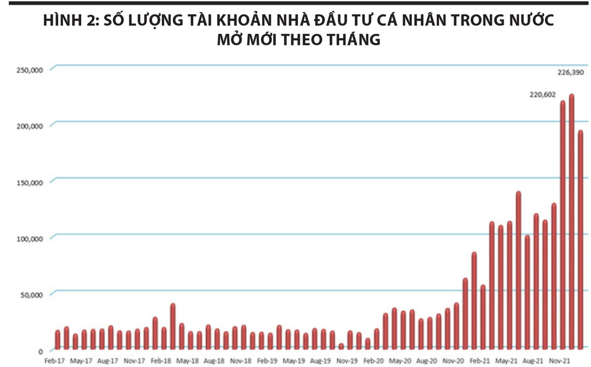 Thứ hai, thị trường chủ yếu vẫn là “cuộc chơi” của nhà đầu tư cá nhân (Hình 2). Lũy kế cả năm 2022, nhà đầu tư cá nhân trong nước đã mở mới gần 2,6 triệu tài khoản chứng khoán, mức kỷ lục trong 22 năm hoạt động của thị trường chứng khoán Việt Nam. Con số này thậm chí còn vượt qua tổng số lượng tài khoản mở mới của 6 năm trước đó (từ 2016 - 2021) cộng lại. Với hiệu suất ấn tượng mà thị trường mang lại cho nhà đầu tư, kênh chứng khoán thu hút dòng tiền, đặc biệt là dòng tiền đầu cơ ngắn hạn. Việc này khiến thị trường bước vào giai đoạn quá mua cùng sự FOMO của lớp nhà đầu tư cá nhân.