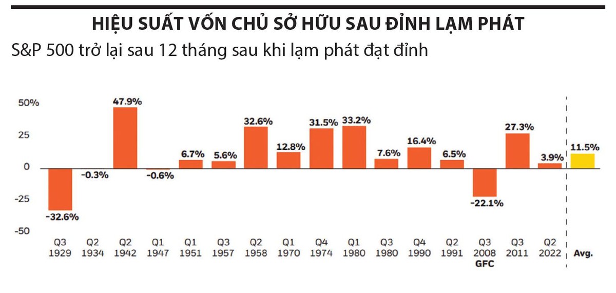 Tony DeSpirito, Giám đốc đầu tư của BlackRock đã phân tích các số liệu từ năm 1927 và nhận thấy rằng S&P 500 (SP500) (SPY) đã tăng trung bình 11,5% (không bao gồm cổ tức) trong năm sau đỉnh lạm phát (đồ thị).