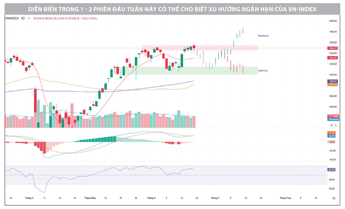 Trừ khi có tiến triển đột phá từ vòng đàm phán thuế quan với Mỹ, VN-Index có thể sẽ tiếp tục dao động trong vùng tích lũy từ 1.300 đến 1.350 điểm trong vài tuần tới. Ngưỡng hỗ trợ quanh 1.300 điểm vẫn là điểm tựa đáng tin cậy, trong khi 1.350 điểm tiếp tục là vùng kháng cự ngắn hạn.