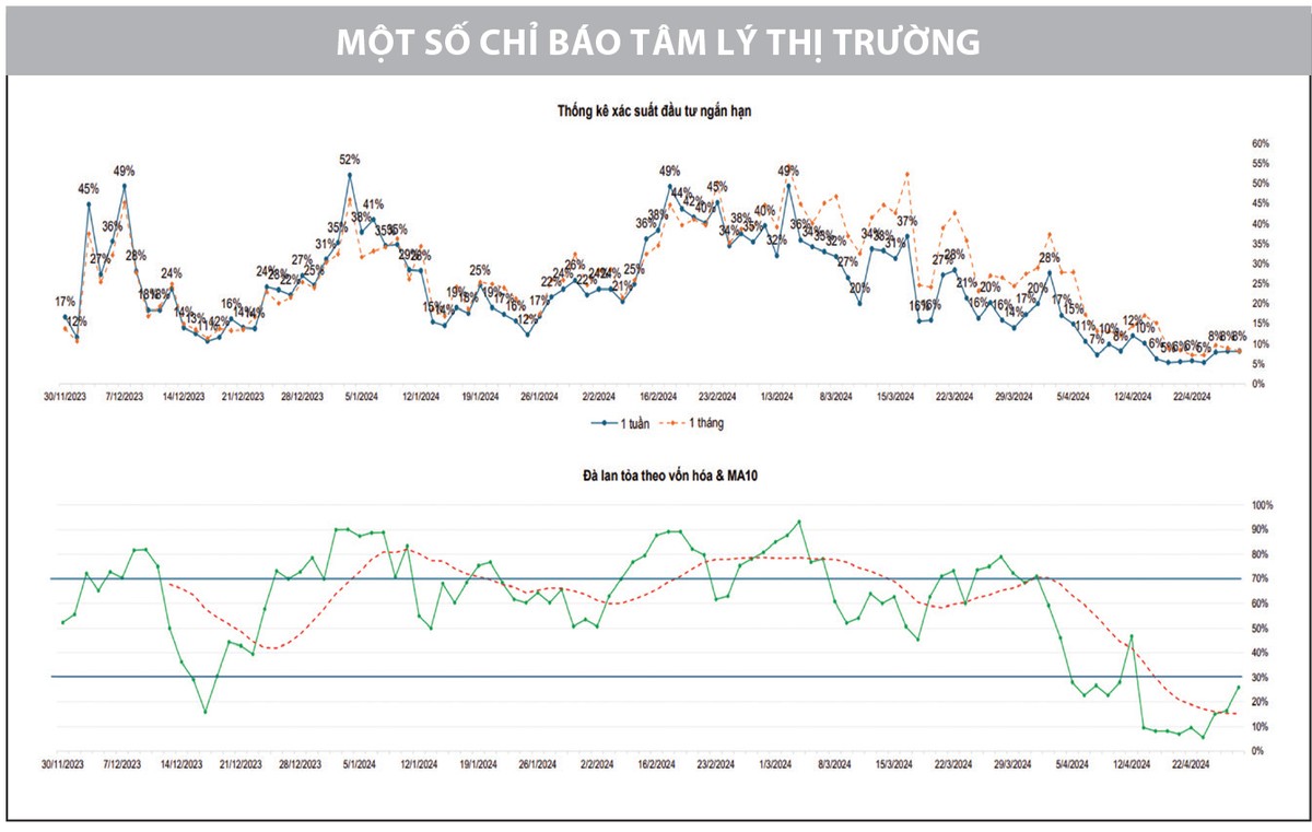 Về các chỉ báo định lượng, trong tuần qua, đặc biệt là phiên cuối tuần, đã có sự cải thiện, đà lan toả có xu hướng cắt lên MA10. Tuy vậy, thanh khoản, lực cầu chưa thực sự mạnh, cho thấy tâm lý nhà đầu tư vẫn còn thận trọng, e ngại thông tin bất lợi có thể xuất hiện trong kỳ nghỉ lễ. Vì vậy, chưa đủ cơ sở để khẳng định thị trường mở ra xu hướng mới.