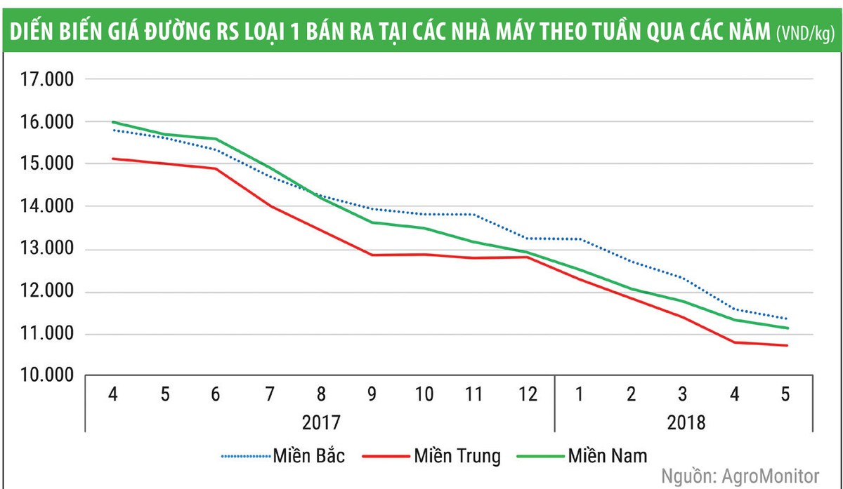 Số liệu của Hiệp hội Mía đường Việt Nam cho biết, trên thị trường thế giới, giá đường trắng tháng 7/2018 giảm 17,75 USD/tấn so với tháng trước đó, xuống 317,85 USD/tấn (trong khi mức trung bình các năm 2016 là 498,13 USD/tấn, năm 2017 là 432,07 USD/tấn).